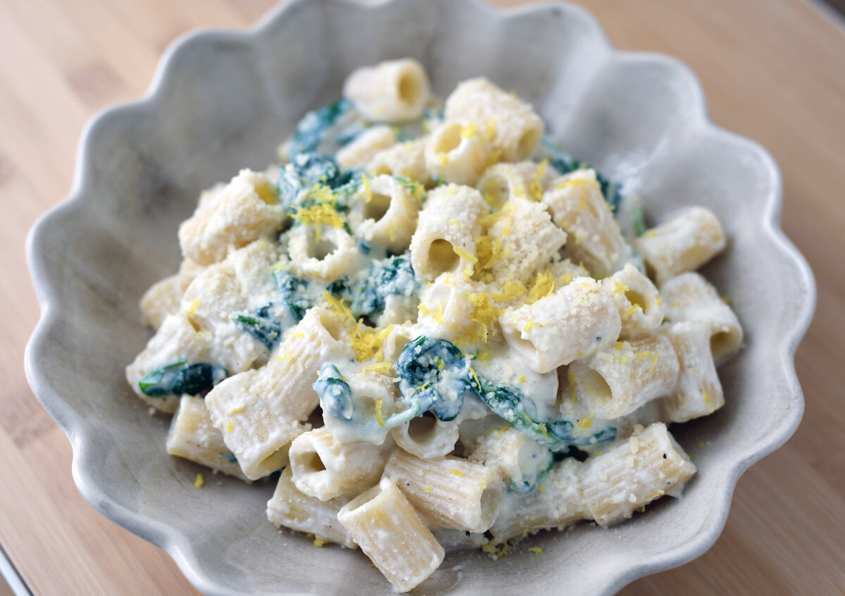 Tämä pasta on vartissa valmista. Simppeliä, raikasta ja herkullista. Kastiketta ei tarvitse keitellä erikseen, ainekset sekoitetaan vain keskenään; kermainen ricotta, parmesaanijuusto, murskattu valkosipulinkynsi, laadukas neitsytoliiviöljy ja raastettu luomusitruunan kuori. Jotta pasta olisi hieman terveellisempi ja täyttävämpi, lisätään joukkoon pinaattia.