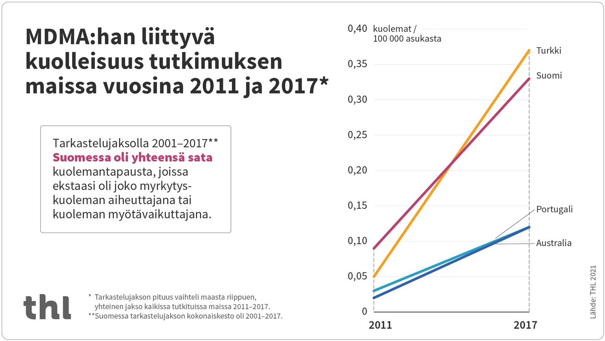 Ekstaasiin eli MDMA:han liittyvien kuolemien määrä lisääntyi Suomessa vuosina 2001–17. Tuoreessa tutkimuksessa tarkasteltiin ekstaasiin liittyvien kuolemantapausten kehitystä pidemmällä ajanjaksolla Suomessa, Australiassa, Portugalissa ja Turkissa. Kyseessä on ensimmäinen kansainvälinen vertailututkimus ekstaasikuolleisuudesta.