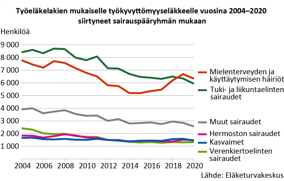 Mielenterveyden ja käyttäytymisen häiriöt (33 %) olivat edelleen yleisin syy siirtyä työkyvyttömyyseläkkeelle. Toiseksi yleisin syy oli tuki- ja liikuntaelinten sairaudet (31 %).