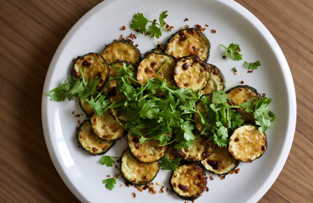 Paahdetut kesäkurpitsalastut valmistetaan sekoittamalla mausteet ja öljyt kesäkurpitsasiivuihin ja paahtamalla uunissa puolisen tuntia.