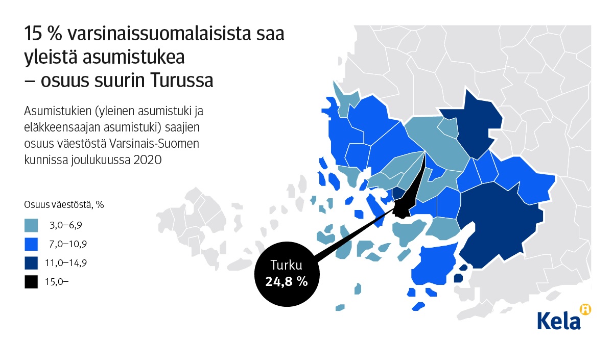 Yleistä asumistukea tarvitaan eniten maakuntien keskuskaupungeissa. Myös Turku erottuu Varsinais-Suomen muista kunnista selvästi. Siellä yleistä asumistukea sai viime vuoden lopussa 27 400 ruokakuntaa. Tukea saaviin ruokakuntiin kuului 48 400 henkilöä eli noin neljännes alle 65-vuotiaista asukkaista.