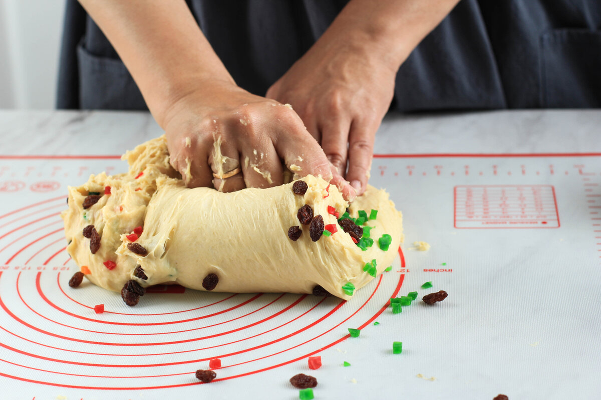 Sekoita rusinat, hillottu appelsiininkuori ja raastettu sitruunankuori pienessä kulhossa. Kaada päälle rommi ja jätä koko seos maustumaan. Sekoita toiseen seokseen kuivahiiva ja sokeri kädenlämpöiseen maitoon. Lisää vartin päästä joukkoon myös vehnäjauhot, munankeltuainen, voi sekä kardemumma. Sekoita kauhalla, vaivaa taikinaa sen jälkeen käsin. Anna taikinan kohota liinan alla kulhossa vähintään tunti. Lisää rommipohjainen seos sen jälkeen mukaan.