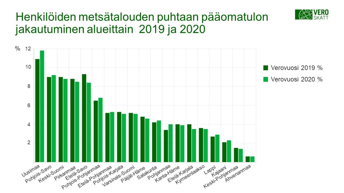 Vuonna 2020 metsätalouden pääomatulosta suurimman osan (11,8 %) saivat henkilöt, joiden kotikunta sijaitsi Uudellamaalla.