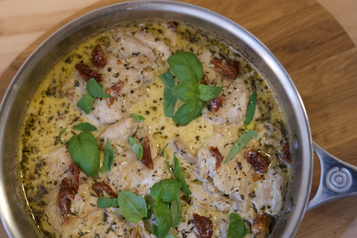 Aurinkokuivatusta tomaatista rakentuu kanalle maukas kermakastike