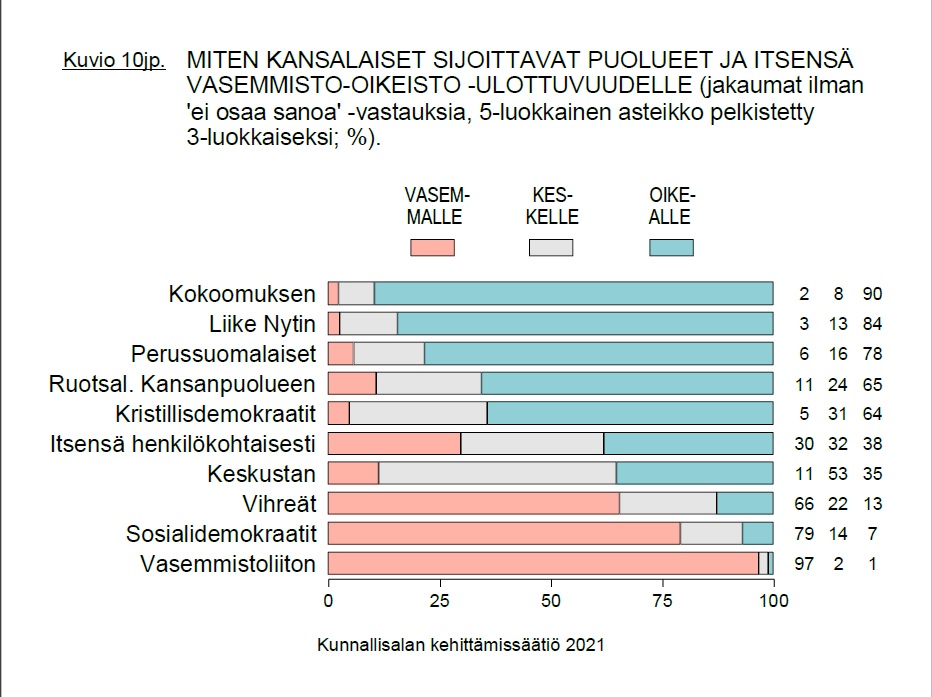 Eniten oikealle sijoittuvat kokoomus (90 %), Liike Nyt (84 %) ja perussuomalaiset 78 %). Tämän jälkeen järjestyksessä tulevat RKP ja kristillisdemokraatit. Vasemmistoliitto (97 %) on vasemmistolaisin, tuntuvasti ennen SDP:tä (79 %) ja vihreitä 66 %). Keskusta sijoittuu keskelle (53 %).