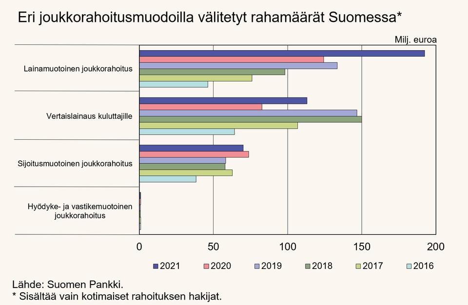 Suomessa vertaislaina- ja joukkorahoitusalustoilla välitettiin rahoitusta kuluttajille ja yrityksille vuonna 2021 määrällisesti enemmän kuin koskaan aikaisemmin. Erityisesti lainamuotoinen joukkorahoitus ja vertaislainaus kuluttajille lisääntyivät. Vaikka välitetyn rahoituksen määrä kasvoi voimakkaasti, se on vielä pieni verrattuna luottolaitosten myöntämään lainarahoitukseen.