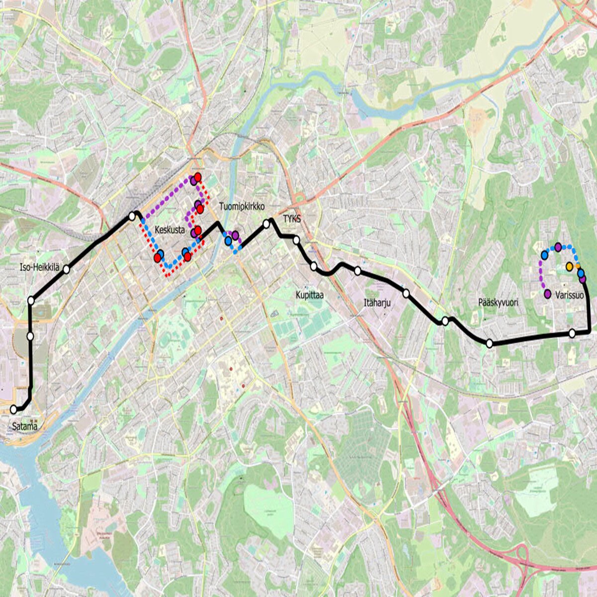 Suunniteltava raitiotie kulkee noin 12 kilometrin matkan Satamasta Kauppatorin ja Tiedepuiston kautta Varissuolle. Reitillä on 17–20 pysäkkiä linjausvaihtoehdosta riippuen. Raitiotien matka-ajan Satamasta Varissuolle on arvioitu olevan noin 35–40 minuuttia. Raitiotielle on tutkittu erilaisia linjausvaihtoehtoja keskustassa, Tuomiokirkon kohdalla ja Varissuolla.