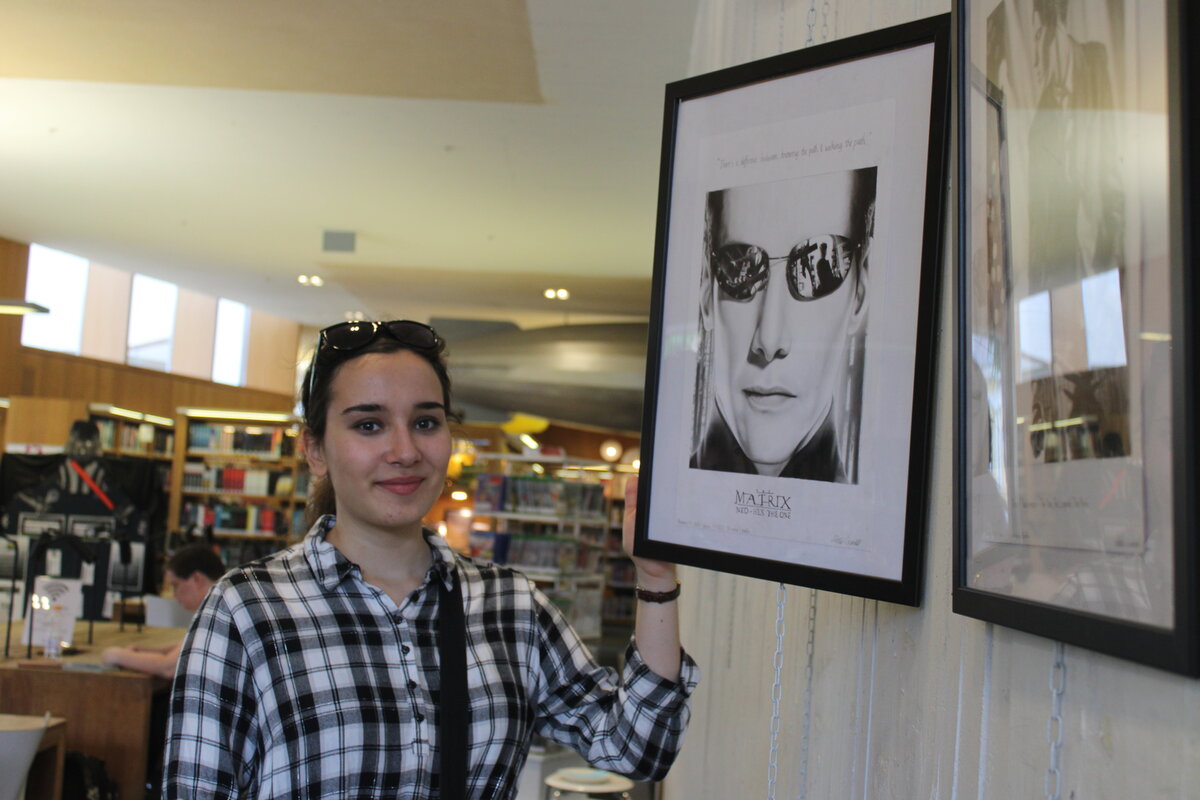 TurkulaisenRita Özcimbitin, 18, piirtämiä realistisia kuvia on esillä Turun pääkirjaston nuortenosasto Stoorin näyttelyseinällä heinäkuun loppuun asti. Hän on harrastanut piirustusta lapsesta asti, ja hän piirtää mielellään julkisuuden henkilöitä sekä fiktiivisiä elokuva- ja pelihahmoja. Näyttelyssä on esillä muun muassa todentuntuisia piirustuksia, joissa näyttäytyvät elokuvamaailmasta tutut Jokerin tai Matrixin hahmot.