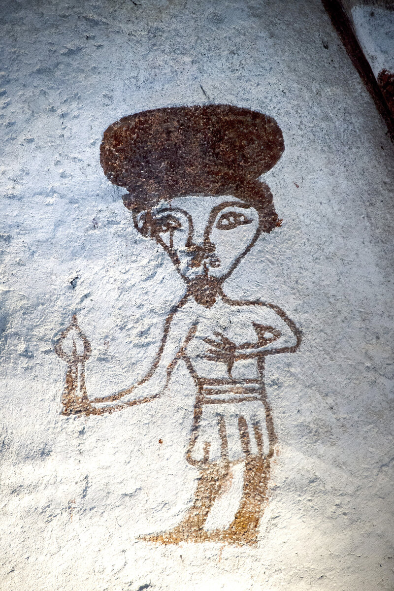 – Ihmiset uskoivat, että paholainen houkuttelee tekemään pahoja tekoja. He uskoivat perinteen mukaisesti, että pahan houkutuksia voidaan estää taikakeinon. Seinillä on viisi- ja kuusikulmia, tähtikuvioita, samoin osmonsolmuja, kuvailee Pussinen.