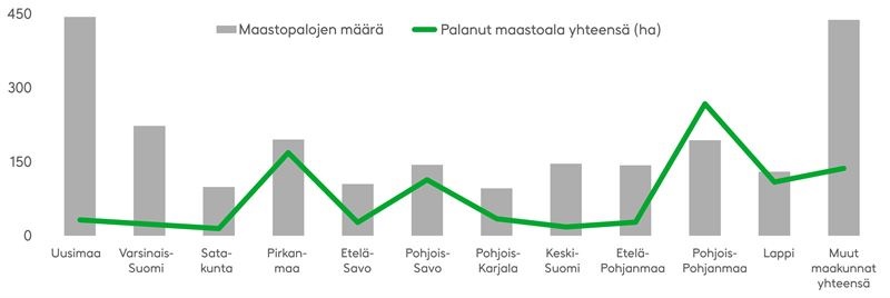 Vähimmillä maastopalovahingoilla selvisi Keski-Pohjanmaan maakunta. Siellä paloi viime vuonna yhteensä vain alle neljä hehtaaria maastoa. Yhteensä koko Suomessa paloi 973 hehtaaria maastoa vuonna 2021.