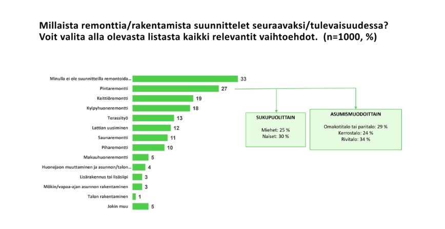 Jopa 27 prosenttia suomalaisista kertoo suunnittelevansa lähitulevaisuudessa pintaremontointia, kuten maalausta tai tapetointia. Isommissa remonttisuunnitelmissa nousevat esiin keittiö ja kylpyhuone: 19 prosenttia vastaajista kertoo suunnittelevansa keittiöremonttia ja 18 prosenttia kylpyhuoneremonttia.