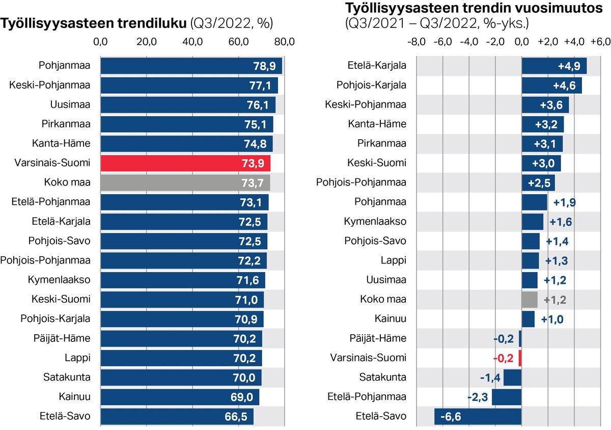 Varsinais-Suomen työllisyysasteen trendiluku oli vuoden kolmannella neljänneksellä hieman koko maan tasoa korkeampi ja maakunnista kuudenneksi korkein. Suurin muutos alueellisissa työllisyyseroissa on, että Pirkanmaan työllisyystilanne on kohentunut merkittävästi. Kun aiemmin Pirkanmaan työllisyysaste oli selvästi koko maan tasoa jäljessä, on se noussut maan parhaimmistoon heti Uudenmaan perään.