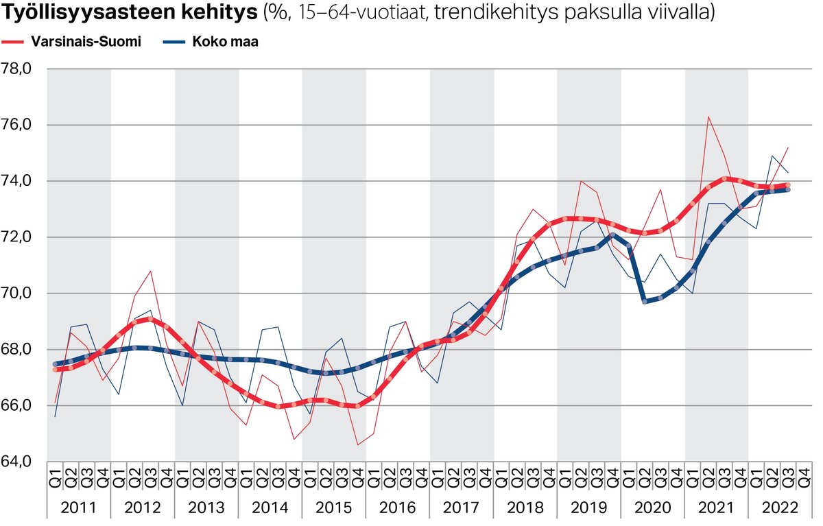 Vuoden kolmannen neljänneksen lukujen valossa näyttää kuitenkin siltä, että työllisyyskehityksen suunta jatkuu melko tasaisena. Merkittävää kasvua tai taantumaa ei ole tapahtunut, ja Varsinais-Suomen työllisyysasteen trendikäyrä on vuoden aikana vakiintunut samansuuntaiseksi koko maan kehityksen kanssa.
