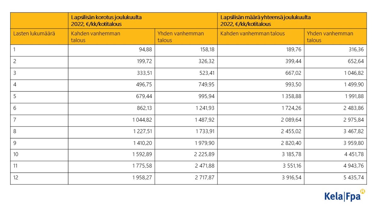 Kela maksaa lapsilisät joulukuussa kaksinkertaisena. Lapsilisää maksetaan jokaisesta Suomessa vakituisesti asuvasta alle 17-vuotiaasta lapsesta. Lapsilisän määrä kasvaa lapsiluvun mukaan. Tämä ei edellytä yhteydenottoa Kelaan eikä erillistä hakemusta. Katso lapsilisän ja yksinhuoltajakorotuksen määrät Kelan verkkosivuilla.