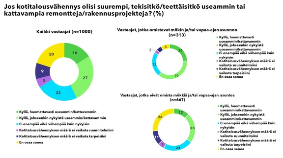 Vastaavasti jopa 24 prosenttia mökin tai vapaa-ajan asunnon omistajista remontoisi huomattavasti useammin tai kattavammin, jos kotitalousvähennys olisi suurempi. 36 prosenttia remontoisi jokseenkin useammin tai kattavammin.