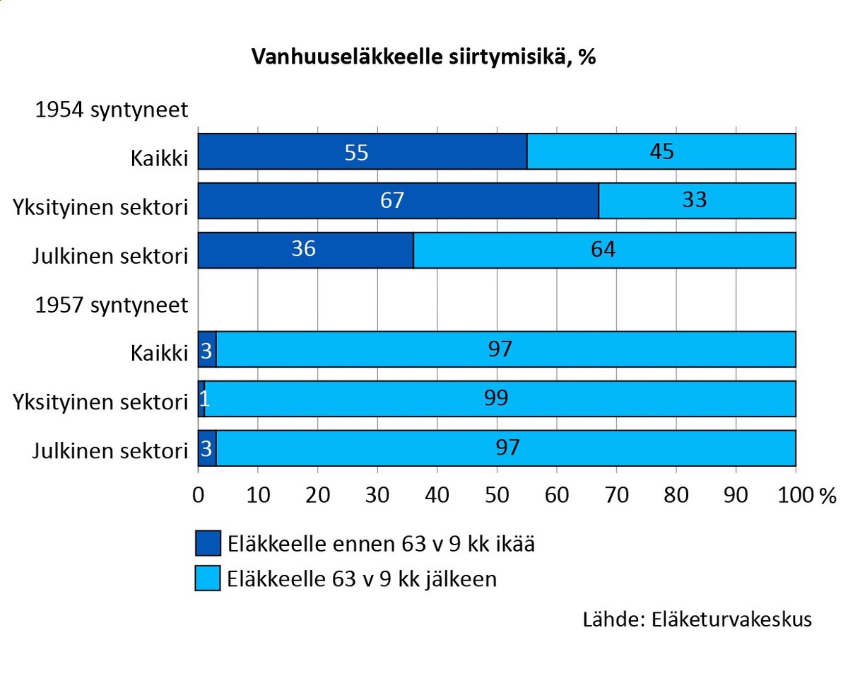 Kun vuonna 1954 syntyneistä yli puolet jäi eläkkeelle ennen 63 vuoden ja yhdeksän kuukauden ikää, vuonna 1957 syntyneistä käytännössä kaikki jäivät eläkkeelle vasta tämän iän jälkeen.