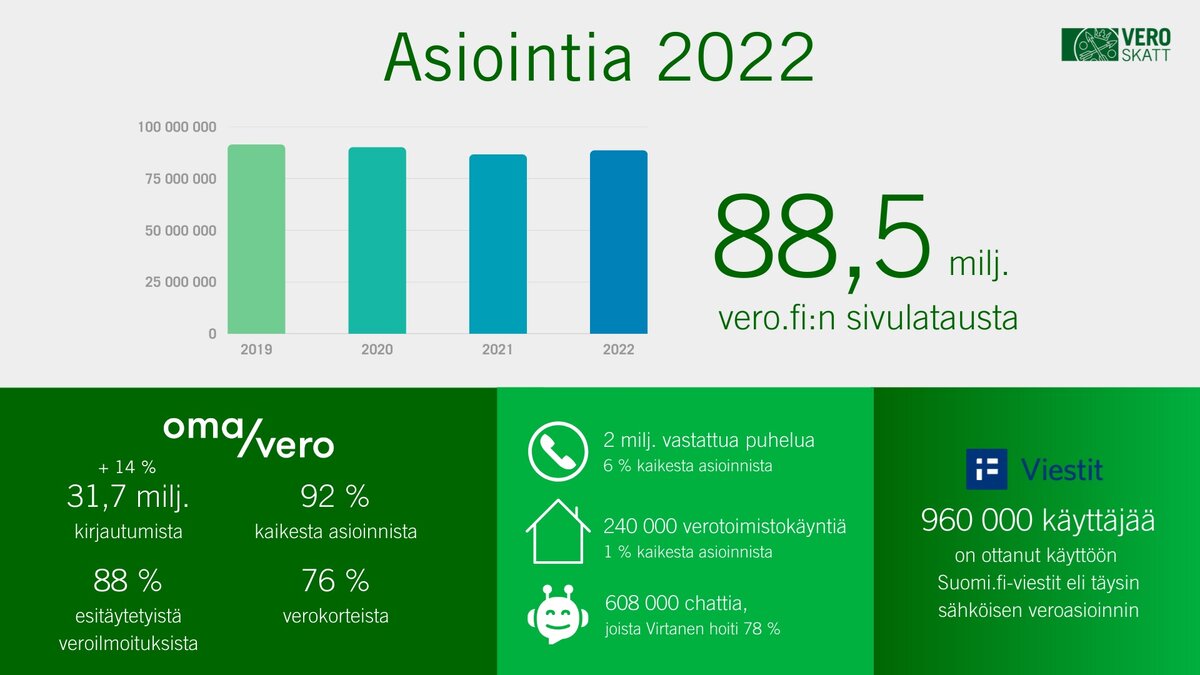 Verohallinnon vero.fi-verkkosivulla oli viime vuonna 88,5 miljoonaa sivulatausta. Se on hieman enemmän kuin vuonna 2021.
