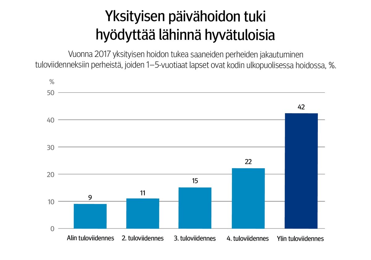 Kelan tutkimuksessa tarkasteltiin muun muassa sitä, millaiset perheet käyttivät yksityisen hoidon tukea vuosina 1997–2017. Tulosten mukaan yli puolet yksityisen hoidon tukea käyttäneistä perheistä oli suurituloisia ja korkeintaan kymmenen prosenttia puolestaan kuului alimpaan tuloviidennekseen.