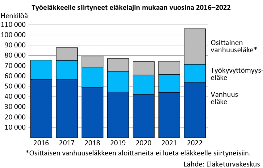 Vuonna 2022 työeläkkeelle siirtyi 71 500 henkilöä. Määrä oli 10 000 henkilöä suurempi kuin edellisenä vuonna. Valtaosa lisäyksestä tuli varsinaiselle vanhuuseläkkeelle siirtyneistä, joita oli 54 000 henkilöä.