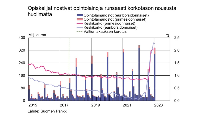 Opintolainoja nostettiin tammikuussa 335 miljoonan euron edestä, mikä on neljä prosenttia vähemmän kuin vuosi sitten vastaavana aikana. Tammikuussa nostettujen opintolainojen keskikorko oli 2,24 prosenttia. Opintolainojen uusien nostojen korot ovat nousseet tammikuusta 2022 alkaen, jolloin keskikorko oli 0,09 prosenttia. Euriborsidonnaisten lainojen osuus oli 88 prosenttia kaikista nostetuista opintolainoista, ja niiden keskikorko oli 2,26 prosenttia. Euriborsidonnaisten opintolainojen uusista nostoista 75 prosenttia oli sidottu kuuden tai kahdentoista kuukauden euriborkorkoon.