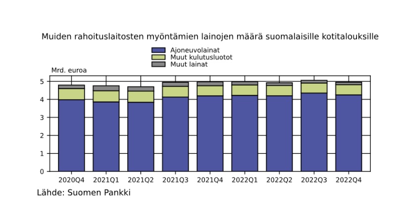 Suomalaiset kotitaloudet nostivat muista rahoituslaitoksista uusia ajoneuvolainoja miljardin euron edestä vuoden viimeisen neljänneksen aikana. Vastaavana aikana luottolaitoksista nostettiin ajoneuvolainoja 375 miljoonaa euron edestä, eli yhteensä ajoneuvolainoja nostettiin 1,4 miljardin euron edestä vuoden viimeisellä neljänneksellä.