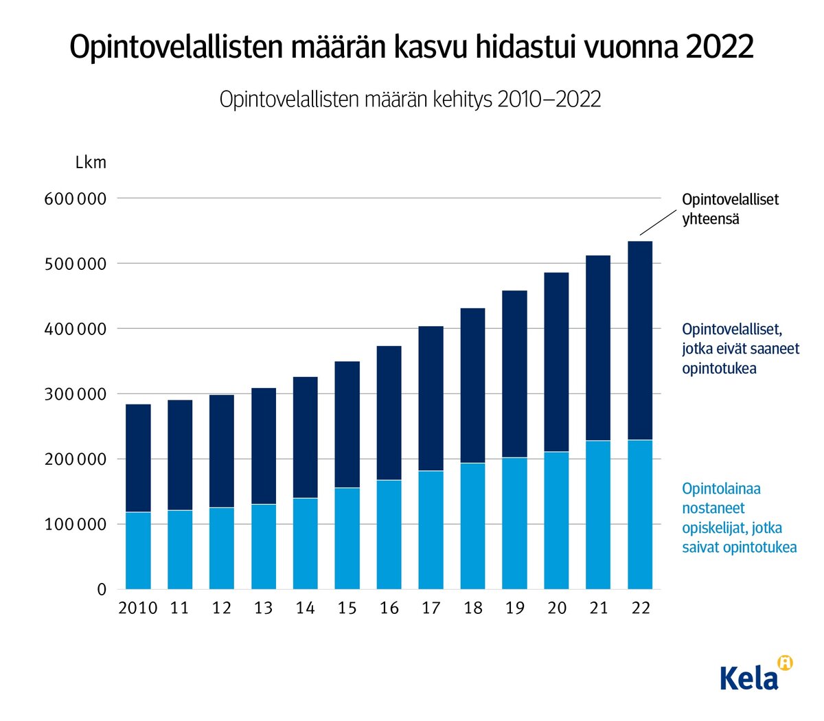 Nyt kasvu on kuitenkin hidastunut. Muutos näkyy selvimmin opintotukea saavien opintovelallisten määrässä, koska se sisältää uudet opintolainan ottajat. Vielä vuonna 2021 opintotukea saavien opintovelallisten määrä kasvoi edeltävästä vuodesta noin 17 000 henkilöllä. Viime vuonna kasvu oli enää noin 1 400 henkilöä.