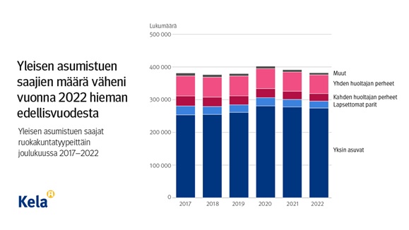 Vuoden 2022 joulukuussa yleistä asumistukea sai 382 232 ruokakuntaa, mikä on noin 9 400 vähemmän kuin edellisvuonna. Suhteellisesti eniten väheni kahden huoltajan kahden huoltajan lapsiperheiden (noin 8 prosenttia edellisvuotta vähemmän) ja lapsettomien parien (7,4 prosenttia edellisvuotta vähemmän) määrä.