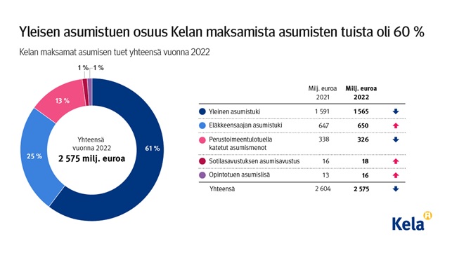 Kela maksoi viime vuonna asumistukia yhteensä 2 249 miljoonaa euroa, joka on hieman vähemmän kuin edellisenä vuonna. Reaalisesti eli inflaation vaikutus huomioiden asumistukimenot vähenivät 7,4 prosenttia. Kun mukaan otetaan asumismenoihin maksetut perustoimeentulotuet, kokonaissumma yltää 2 574,8 miljoonaan euroon, sillä Kelan maksamasta perustoimeentulotuesta 325,9 miljoonaa euroa kohdentui laskennallisesti asumismenoihin.