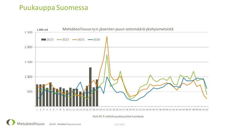 Tammi–huhtikuussa kuitupuun ostomäärä oli 5,9 ja tukkien ostomäärä 5,1 miljoonaa kuutiota. Viiden vuoden keskiarvoon verrattuna kuitupuun ostomäärä oli 16 prosenttia ja tukkien 24 prosenttia suurempi.
