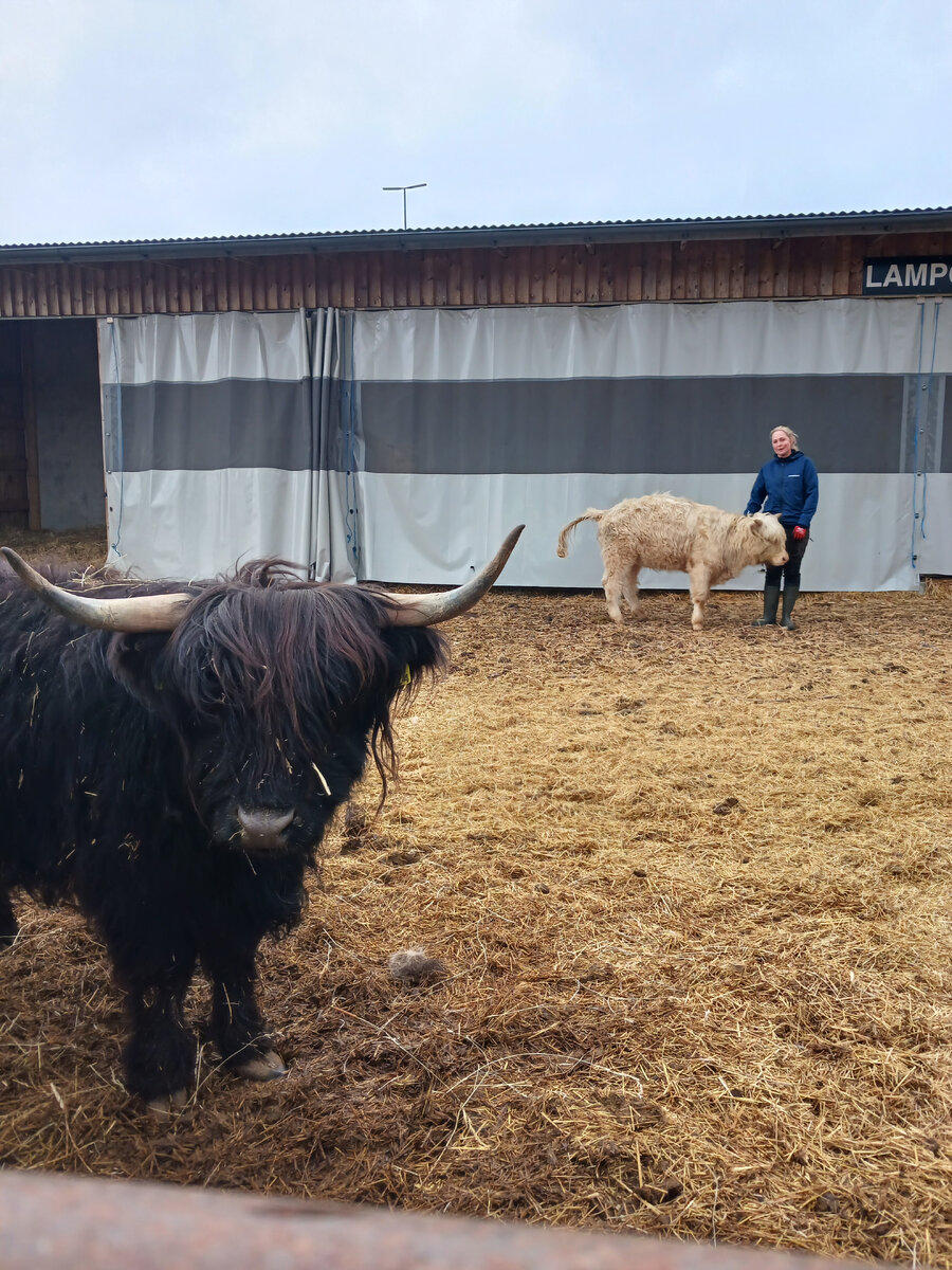 Jos lampaat olivat ujolla päällä, samaa voi sanoa myös lehmistä, jotka ovat päiväunilla ilmavassa pihatossa. Luonnonvaloa ja tilaa riittää moderneissa tiloissa, joissa eläimet viihtyvät. Vasikoilla on oma ”vasikkapiilonsa”, jonne ne pääsevät sisään pienestä reiästä. Hiljattain syntyneet kaksosvasikat ovat unilla toisessa päädyssä, jonne Lindblom siirtyy niitä jututtamaan. Hän hoitaa neljääkymmentä emolehmää, jotka kuuluvat Hereford- ja Aberdeen Angus -rotuihin. Vasikoita on 38.