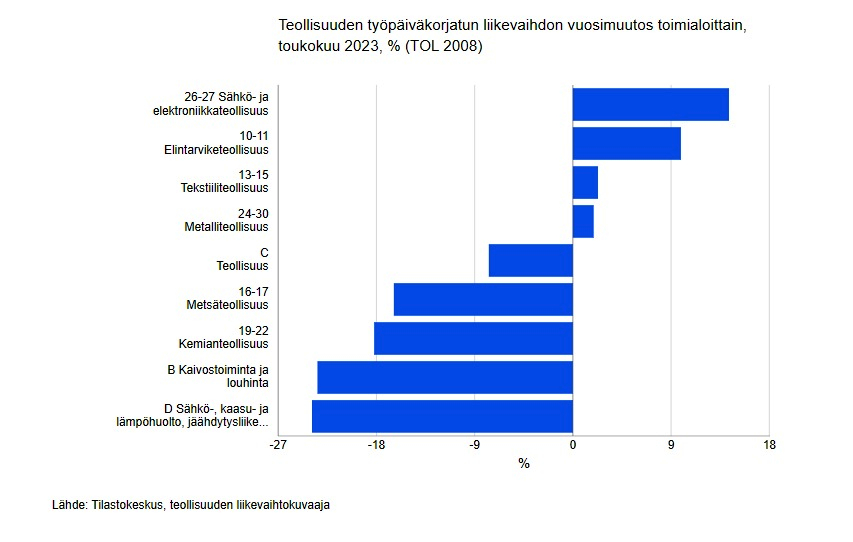 Liikevaihto väheni toukokuussa eniten sähkö-, kaasu-, lämpö- ja ilmastointihuollon toimialalla ja oli 23,9 prosenttia pienempi kuin vuotta aiemmin. Kemianteollisuuden liikevaihto väheni 18,2 prosenttia ja metsäteollisuuden liikevaihto 16,4 prosenttia vuodentakaisesta. Liikevaihto kasvoi voimakkaimmin sähkö- ja elektroniikkateollisuudessa, 14,3 prosenttia vuodentakaisesta.