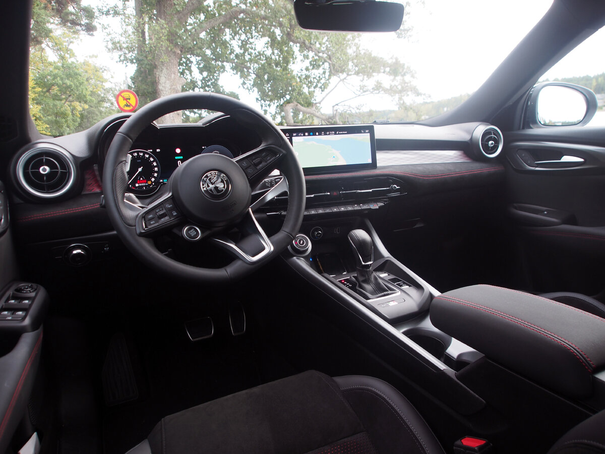 Ratin takana katse nauliutuu Alfa Romeolle ominaiseen Cannocchiale-kojetauluun, joka Tonalessa on täysin digitaalinen. Kehitys kehittyyy, mutta ei niissä syvissä kuilumaisissa analogisissakaan mittareissa mitään vikaa ollut. Urheilullisuus korostuu jo penkeissä, jotka ovat sellaista pintamateriaalia, että housut suorastaan liimautuvat niihin kiinni. Kojelaudan sävytyksessä on laavamaista hehkua ja Amazon Alexa -ääniavustaja mahdollistaa Amazonin palveluiden helpon hyödyntämisen.