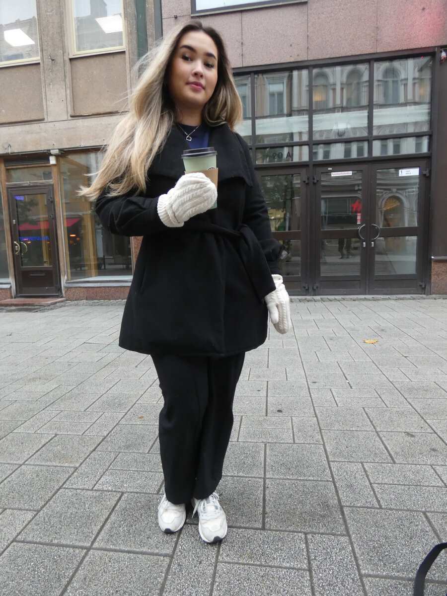 – Pukeutumiseni perustuu rentouteen ja käytännöllisyyteen. On helppoa vetää tällainen iso takki päälle ja tämä tuntuu jotenkin ryhdikkäältä, kertoo Jenny Berglund, 23.