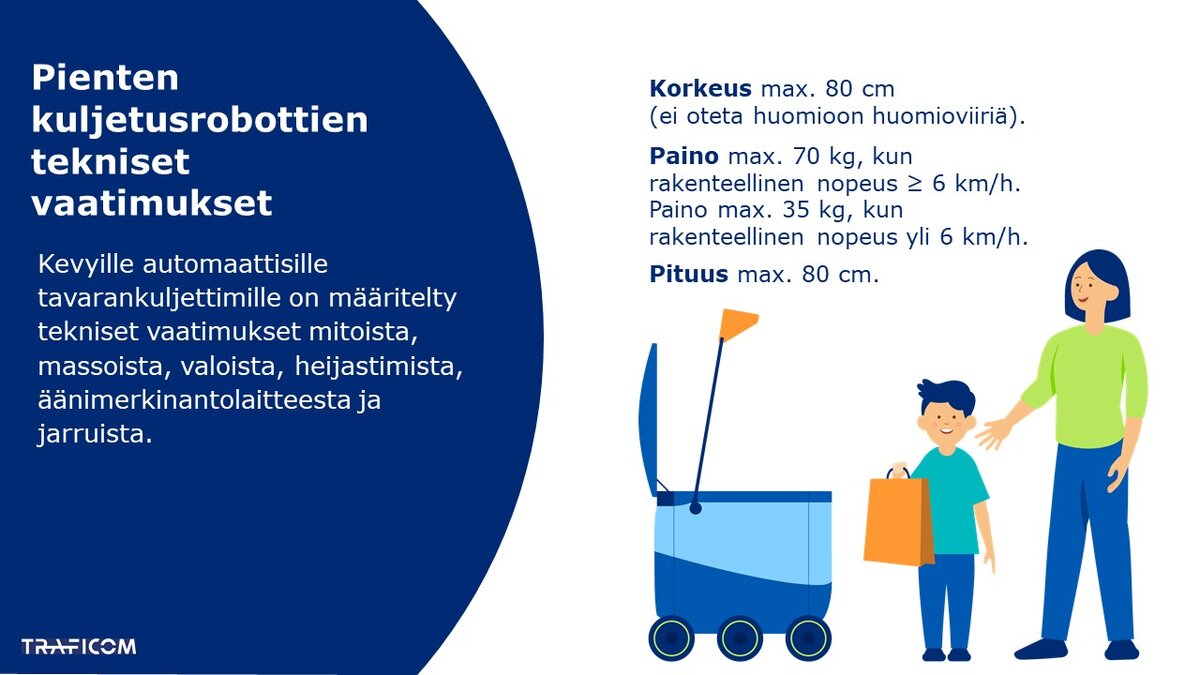 Kevyille automaattisille tavarankuljettimille eli pienille kuljetusroboteille on määritelty tarkemmat tekniset vaatimukset mitoista, massoista, valoista, heijastimista, äänimerkinantolaitteesta ja jarruista. Uudet vaatimukset tulevat voimaan 1.1.2024.