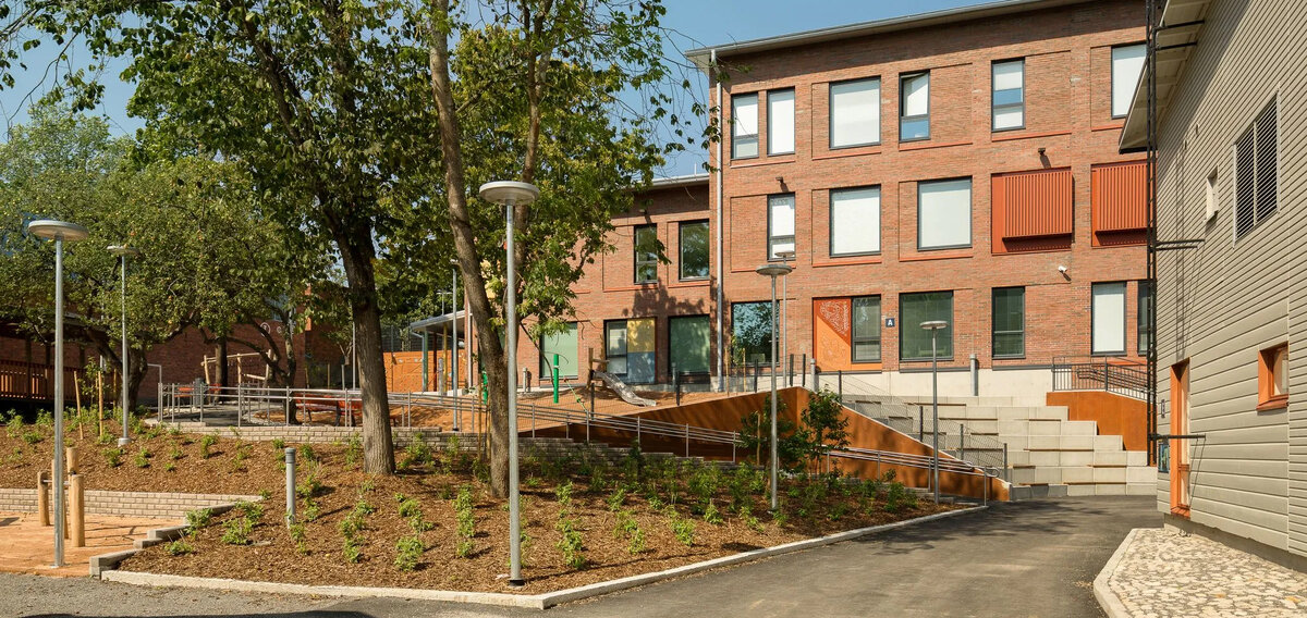 – Punatiilinen sisäpihan lisärakennus yhdistää korttelin kokonaisuudeksi luontevasti. Korttelissa olevia vanhoja hirsisiä koulurakennuksia on lisärakentamisen yhteydessä korjattu laadukkaasti. Piha on suunniteltu ja toteutettu tasokkaasti lasten maailmaan eläytyen, jolloin tiiviin rakentamisen lomaan on saatu toteutettua aktiivinen ja kokoaan suuremmalta tuntuva piha, kertoo Tuominen.