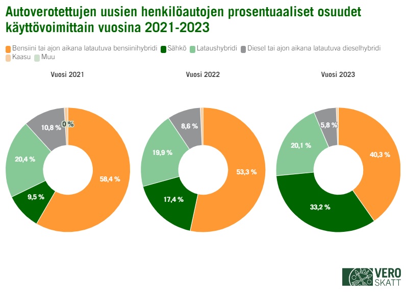 Vuonna 2023 autoverotetuista ajoneuvoista 28,5 prosenttia oli sähkökäyttöisiä, mutta maksuunpannun autoveron määrästä vain 2,4 prosenttia kertyi sähköajoneuvoista.