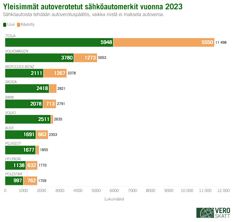 Sähköajoneuvojen yleisimmät merkit olivat puolestaan Tesla (25,3 %), Volkswagen (11,1 %) sekä Mercedes-Benz (7,4 %). Tesloista noin puolet oli uusia ja puolet käytettyjä.