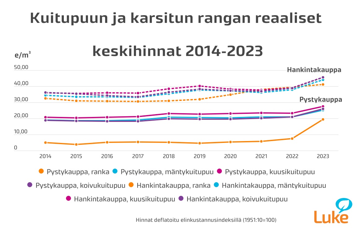 Hankintakaupoissa rangan ja kuitupuun hinnat ovat olleet jo pitkään lähellä toisiaan. Pystykaupoissa rangasta maksettiin aikaisemmin noin neljäsosa kuitupuun hinnoista, kunnes vuonna 2022 hintaero alkoi kaventua nopeasti.