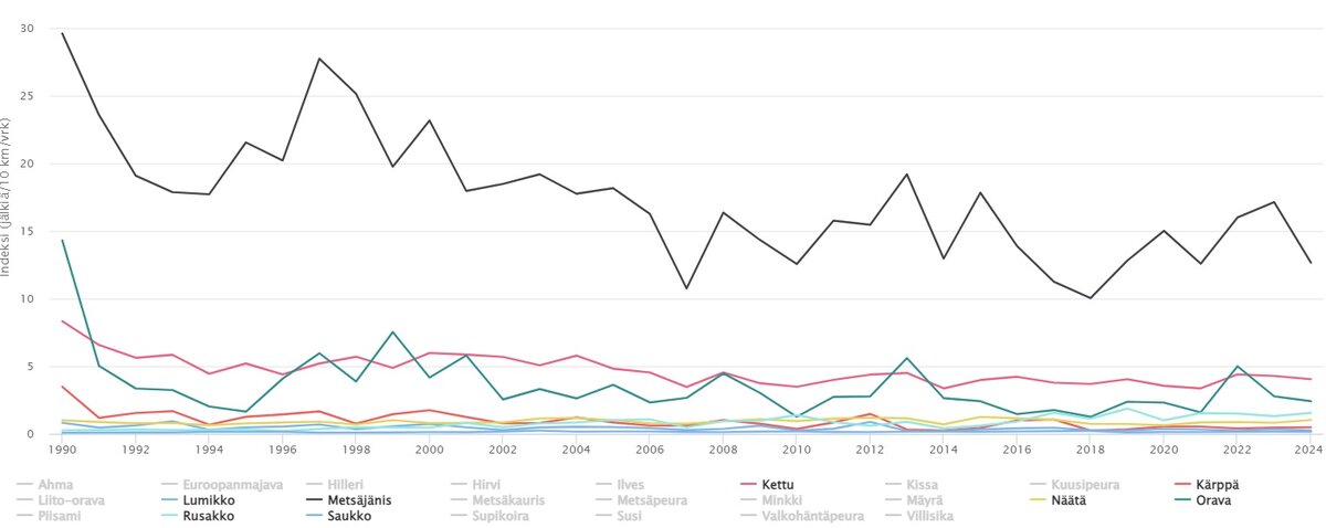 ─ Suurin poikkeus lajijoukossa on voimakkaasti runsastuva rusakko, joka viihtyy parhaiten rannikon peltomaisemissa. Rusakon lumijälki-indeksi on yli kymmenkertaistunut vuodesta 1989 alkaneen tarkastelujakson aikana. Runsastuminen on voimakkaampaa itään mentäessä, ehkä siksi, että maan länsiosissa sopivat ympäristöt ovat jo tiuhaan lajin asuttamia, Lindén pohtii.