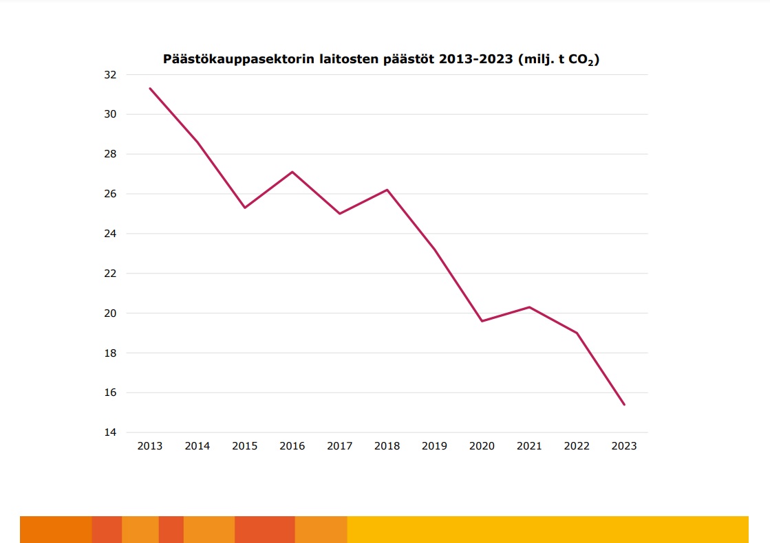 EU:n päästökauppaan kuuluvien suomalaisten laitosten yhteispäästömäärä oli 15,4 miljoonaa tonnia hiilidioksidia viime vuonna. Päästöt pienenivät 19,2 prosenttia vuoden 2022 päästömäärästä.
