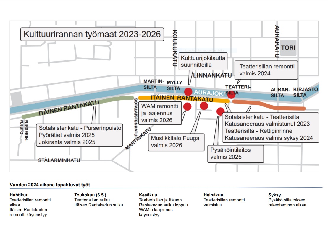 Myllerrys Aurajokirannassa jatkuu. Itäinen Rantakatu suljetaan yleiseltä ajoneuvoliikenteeltä Myllyahteen ja Kaskenkadun väliltä noin kuukauden ajaksi. Teatterisillan remontin edetessä myös silta on suljettu 4–6 viikkoa. Uuden pysäköintilaitoksen rakentaminen, WAMin laajennustyöt sekä musiikkitalo Fuugan työmaa aiheuttavat ajoittaisia häiriöitä alueella liikkuville.