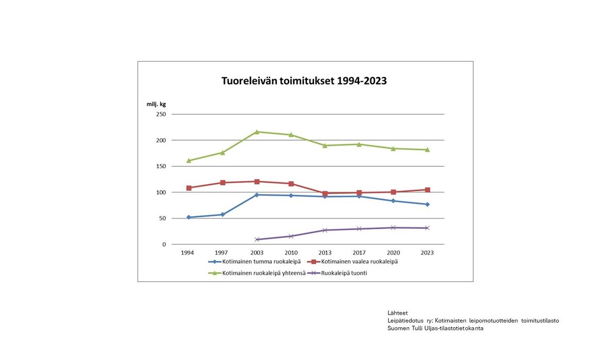 Tiedot käyvät ilmi Leipätiedotus ry:n Leipomotuotteiden toimitustilastosta sekä Tullin Uljas-tilastotietokannasta.