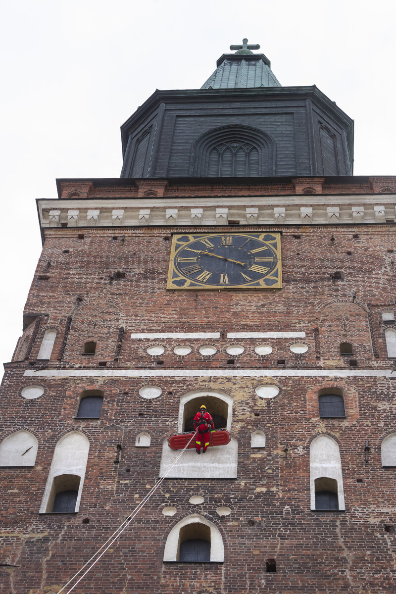 Turun tuomiokirkon torni ei ole suurelle yleisölle avoinna, sillä reitti sisältää kapeita kierreportaita ja muita vanhoja rakenteita. Harjoituksella halutaan testata mahdollisuutta saada esimerkiksi loukkaantunut henkilö alas tornista, koska paarien kantaminen sisäkautta tornista on käytännössä mahdotonta. Tornin korkeus merenpinnasta on 85 metriä, mutta harjoitus tapahtuu suunnilleen kellotornin puolivälistä kellotaulun alapuolelta.