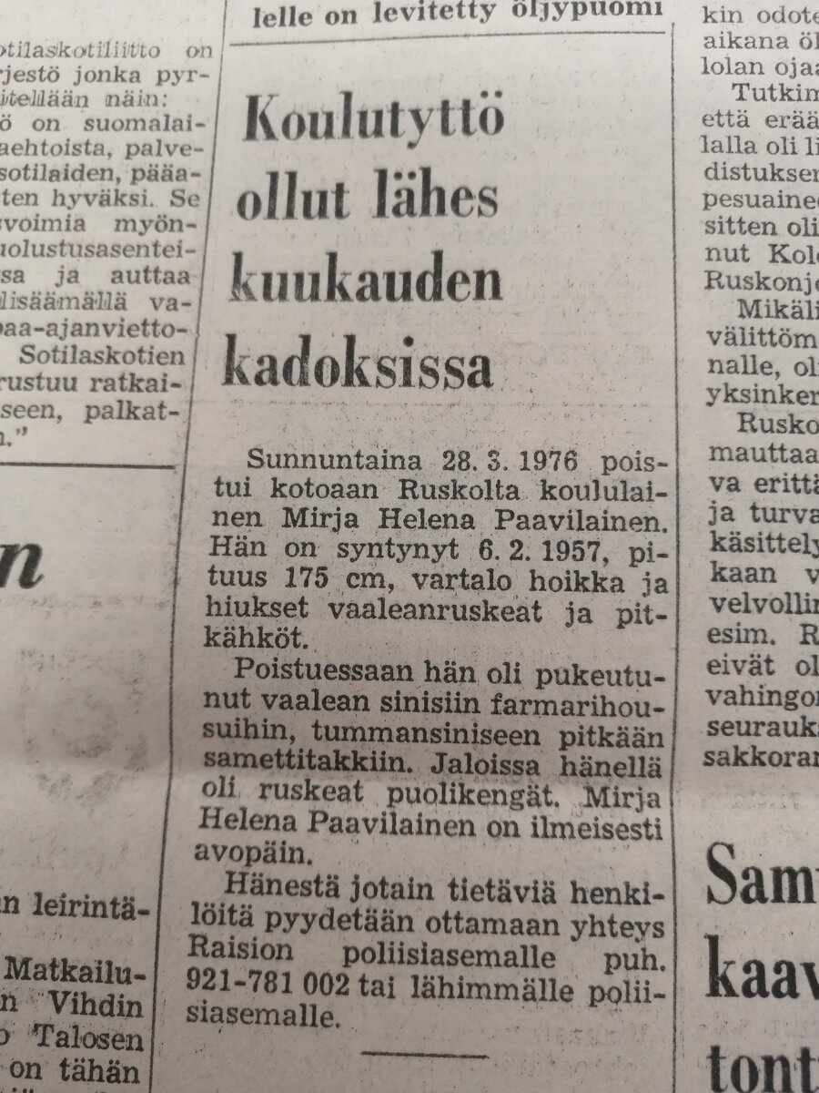 Turussa oppikoulua käynyt Mirja Helena Paavilainen, 19, katosi kotoaan Ruskolta kesken ylioppilaskirjoituksiin valmistautumisen vuonna 1976. Nuoren naisen mysteeri on jäänyt unholaan, vaikka siinä on samoja elementtejä kuin Piia Ristikankareen katoamisessa Piikkiöstä 12 vuotta myöhemmin.