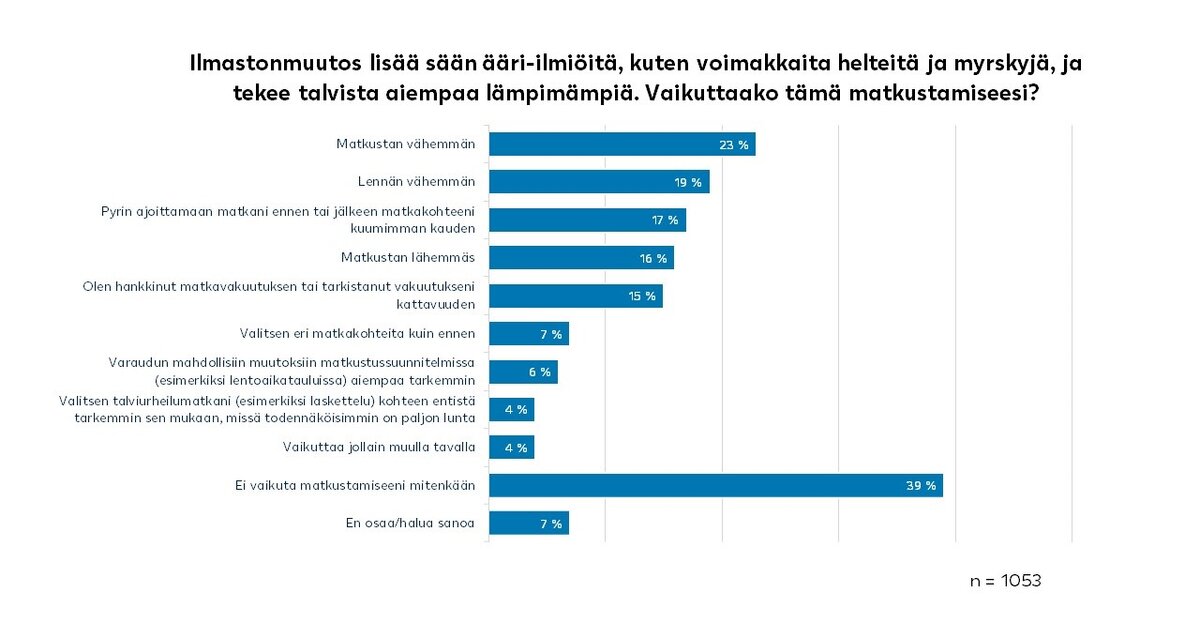 Ilmastonmuutoksen lisäämät sään ääri-ilmiöt ja aiempaa lämpimämmät talvet vaikuttavat valtaosan suomalaisista matkustustottumuksiin, selviää LähiTapiolan teettämästä Arjen katsaus -kyselystä. Lähes neljäsosa vastaajista (23 prosenttia) kertoi matkustavansa vähemmän ja viidesosa (19 prosenttia) lentävänsä vähemmän. 17 prosenttia kertoi pyrkivänsä ajoittamaan matkansa ennen tai jälkeen matkakohteen kuumimman kauden.