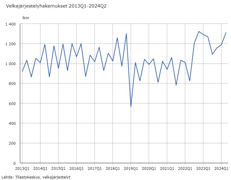 Tilastokeskuksen mukaan tammi–kesäkuussa käräjäoikeuksiin jätettiin 2 499 yksityishenkilöiden velkajärjestelyhakemusta. Hakemuksia jätettiin 60 (2,3 %) vähemmän kuin vastaavana ajankohtana vuotta aiemmin.