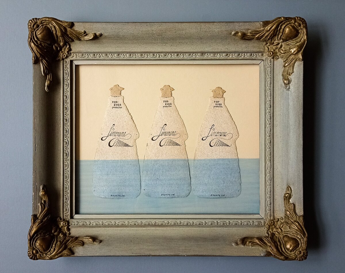 Teoksessaan Beautiful Cosmetics Vainion ruokopaperista valmistamat kosmetiikan purkit, pullot ja purnukat ovat esillä kauniissa kehyksissä.
