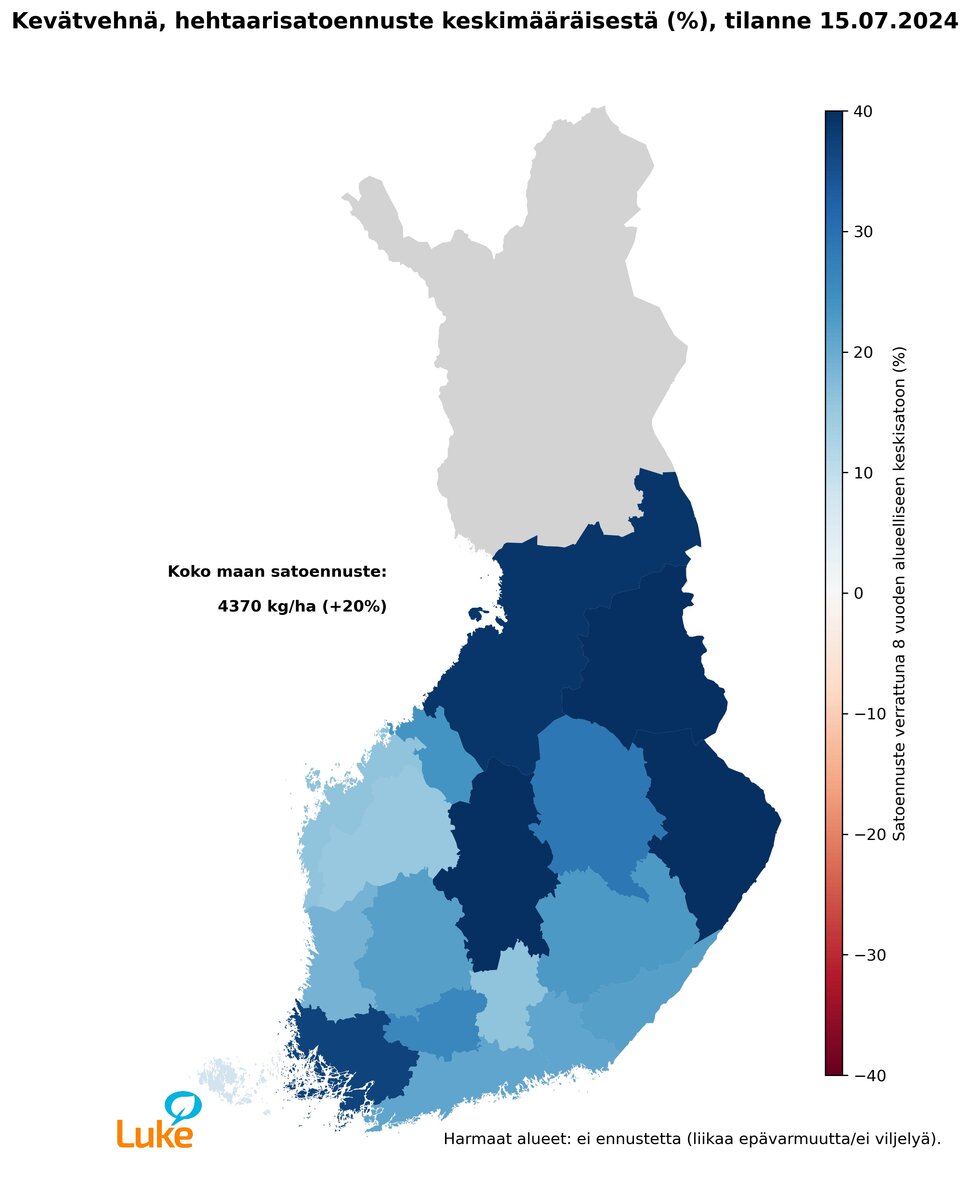 Luonnonvarakeskuksen (Luke) tilastopalvelut on kehittänyt satelliittikuviin perustuvan menetelmän viljojen sadon ennustamiseen. Jos menetelmä osoittautuu tulevina vuosina käyttökelpoiseksi, sillä voidaan korvata ja täydentää viljelijöiltä kyselyillä kerättäviä tietoja. Satelliittikuviin perustuva satoennuste povaa tällä hetkellä kevätvehnän, kauran sekä rehu- ja mallasohran osalta hieman keskimääräistä suurempia hehtaarisatoja koko maahan.