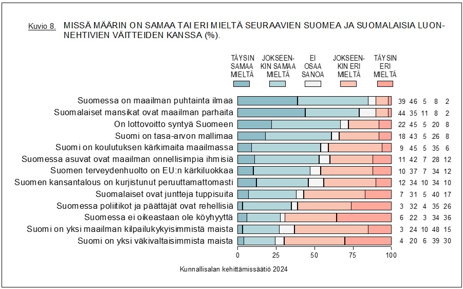Kunnallisalan kehittämissäätiö (KAKS) on selvittänyt suomalaisten näkemyksiä Suomesta ja suomalaisuudesta. Vastaajat arvioivat kolmeatoista Suomea ja suomalaisia kuvaavaa ominaispiirrettä kertomalla, missä määrin he ovat niistä samaa tai eri mieltä.