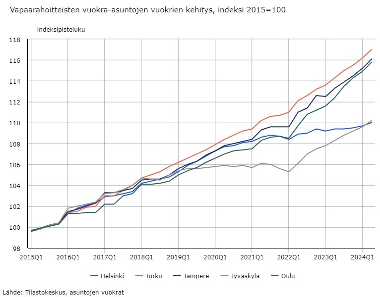 Tilastokeskuksen mukaan vapaarahoitteisten asuntojen vuokrat nousivat huhti–kesäkuussa pääkaupunkiseudulla 0,5 prosenttia ja muualla Suomessa 2,0 prosenttia vuodessa. Eniten vapaarahoitteisten vuokra-asuntojen vuokrat nousivat Oulussa (3,0 %), Rovaniemellä (2,8 %) sekä Hämeenlinnassa (2,7 %) ja vähiten Raumalla (0,2 %), Vantaalla (0,3 %) sekä Mikkelissä (0,4 %).